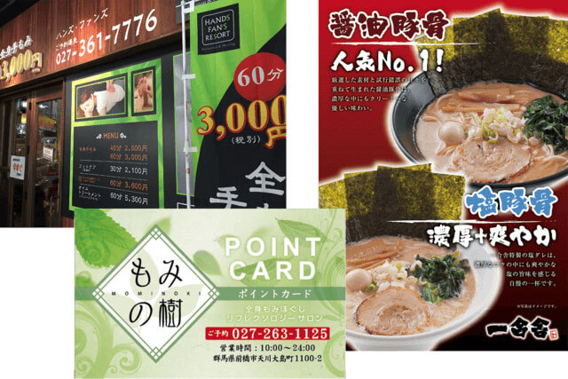 看板 / 名刺 / メニュー / ロゴマーク / ポストカード / のぼり / 封筒 / ホームページ / リーフレット / スタンプカード / その他広告物、集客ツールなど
